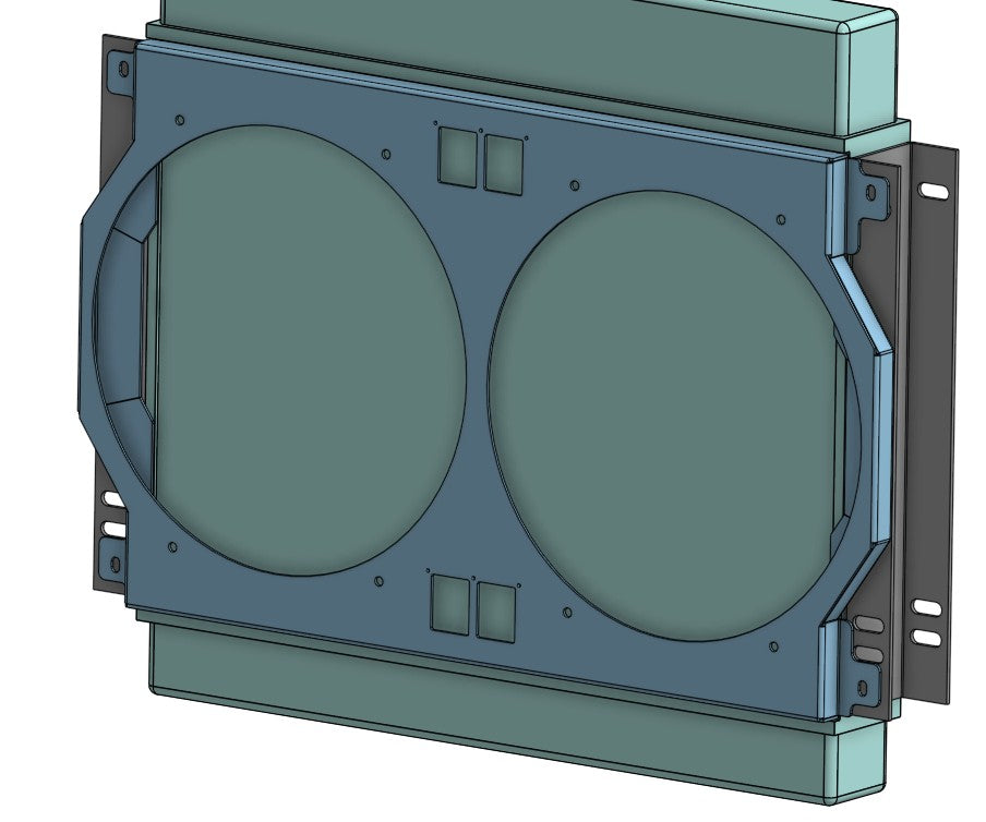 This particular shroud design in the below CAD Renderings. The pictures shown are a similar design Matte Black Powder Coated Shroud for 66/67 Chevelle's that show the fastener locations on the sides of the shroud, utilizing the side C channels for mounting. There are a total of 8 threaded M6x1 holes for the fans, and four slots for mounting into the side brackets. I highly recommend using 6x1 Rivnuts in the radiator uprights to provide a firm mounting surface.