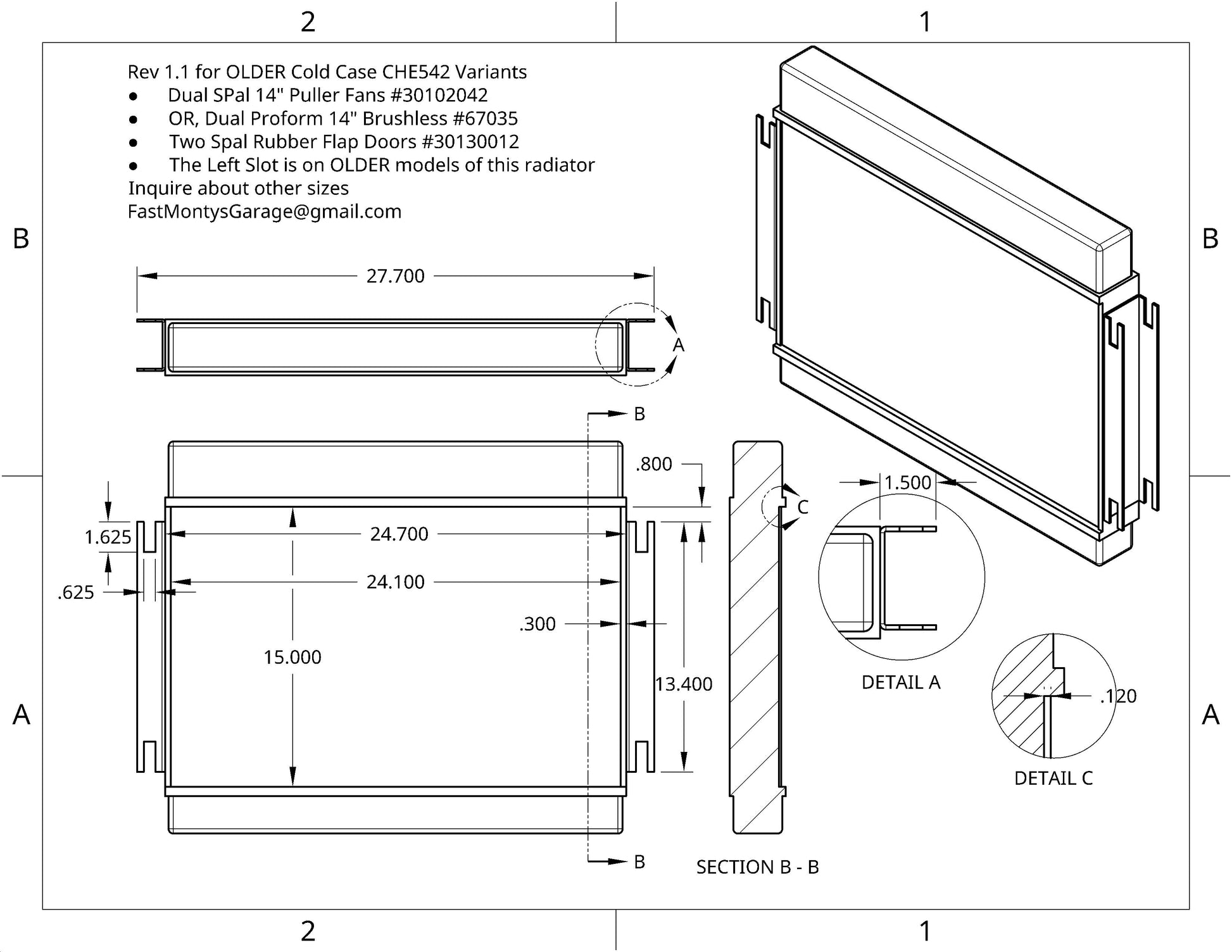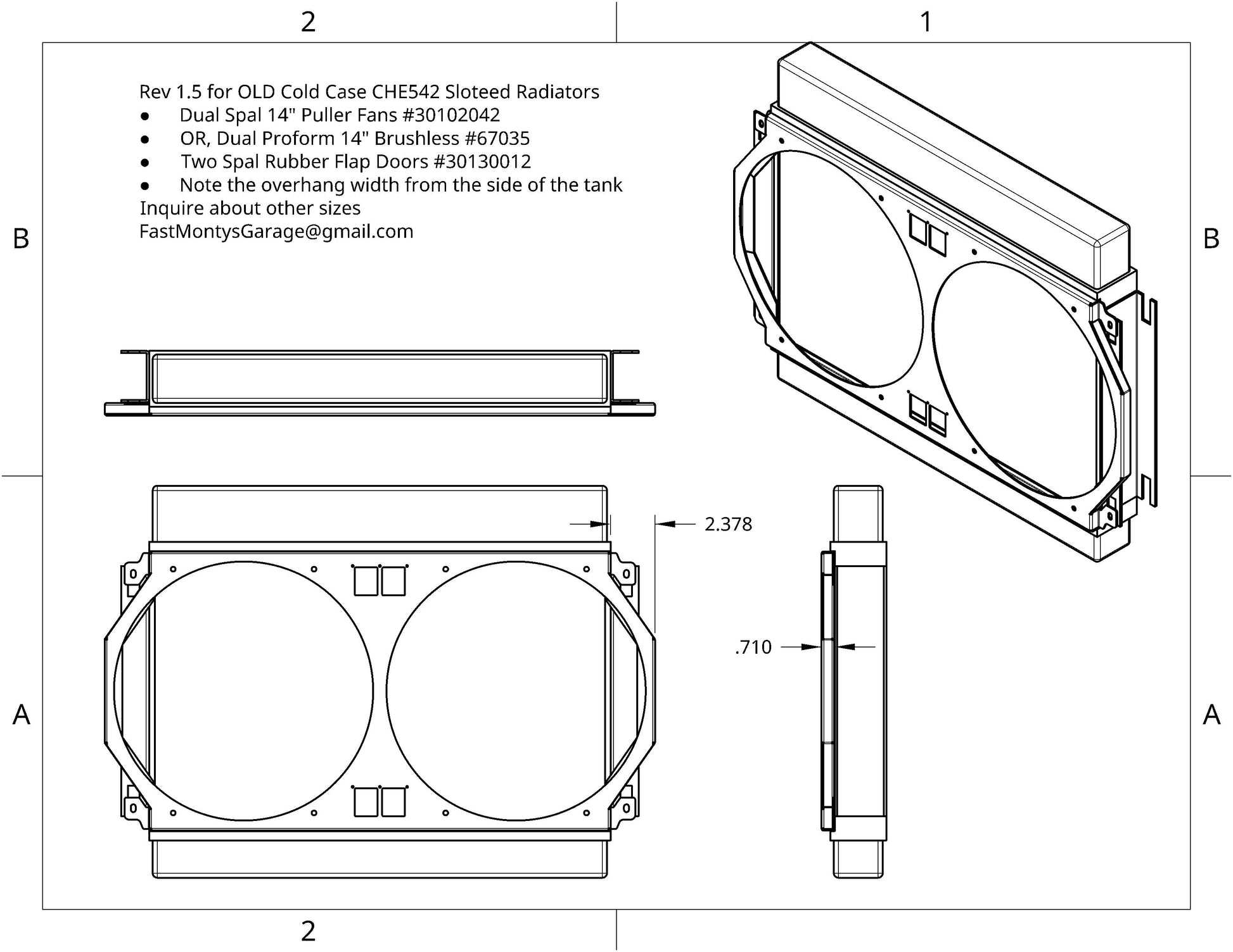 NOTE: Check for fit! There are two different CHE542 flange variants, Slotted and non-slotted depicted in the radiator rendering. This shroud will fit both the older Slotted Radiator, and the new style. The shroud fan mounting surface is 0.830" away from the core (finned area). For the Matte Black version, I will include Twelve M6x1 fasteners. (It's also the lowest cost Powder Coated option) Please double check you have space for Fans! The 14" Proform fans are the lowest profile around the motor area.