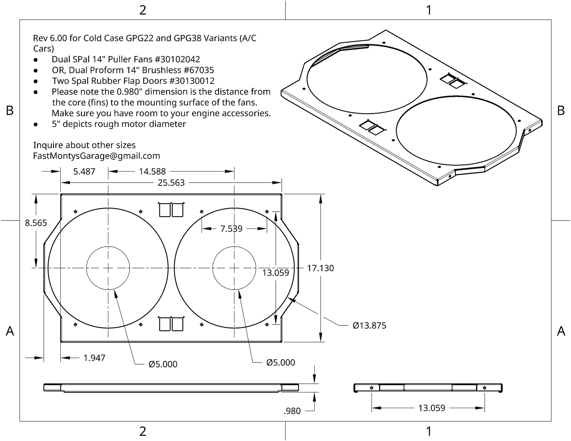 Note: This is an aftermarket shroud designed to work with the Cold Case GPG34 radiator. It is not manufactured by Cold Case Radiators. Fans and installation accessories sold separately. Lead time for Raw Aluminum is around one week. If Powder Coated is out of stock, please order, as we do not replace stock without an existing order, lead time is two weeks.