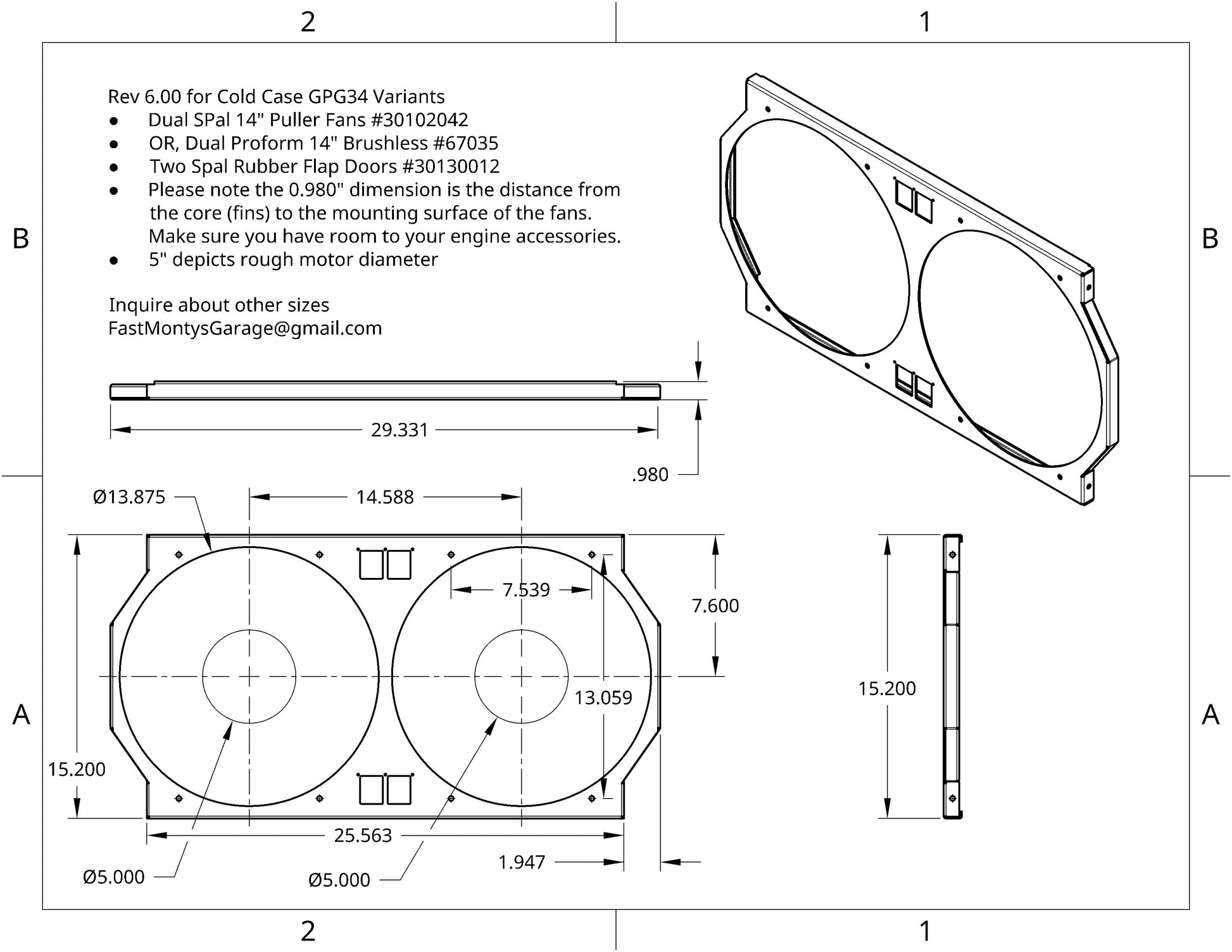 Note: This is an aftermarket shroud designed to work with the Cold Case GPG34 radiator. It is not manufactured by Cold Case Radiators. Fans and installation accessories sold separately. Lead time for Raw Aluminum is around one week. If Powder Coated is out of stock, please order, as we do not replace stock without an existing order, lead time is two weeks.