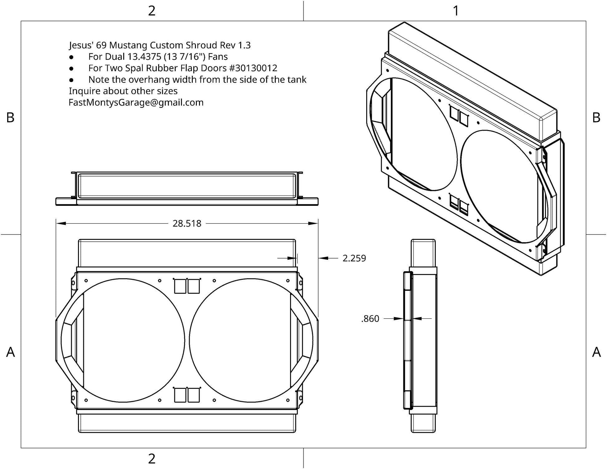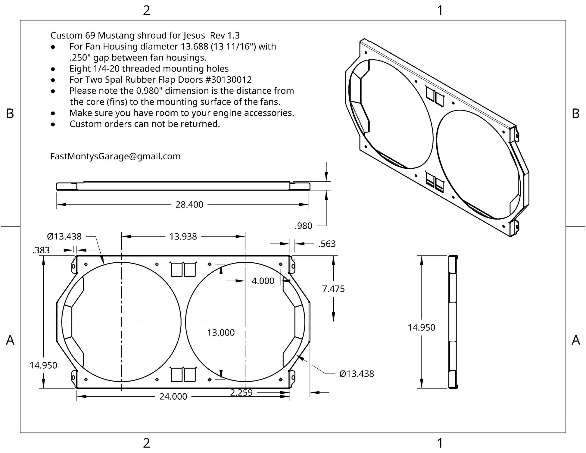 Designed for a 69 Mustang Downflow shroud with a 24 x 15 inch Core. The shroud is built for Dual Ford Taurus 13.5 inch fans, and fits Two Rubber flap doors, Spal part #30130012. The fan mounting holes are flush mount 1/4-20 nuts. Custom Designed by Monty and manufactured by SendCutSend. Please see attached drawings and renderings. This is a custom shroud, and can not be returned after being ordered. If your radiator is close to this size, please send me an email and we can discuss.